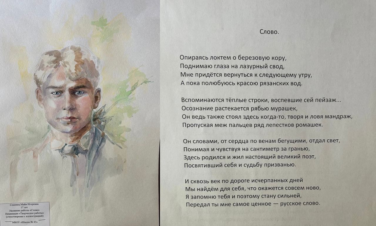 В этом году конкурс был посвящен очень трепетной теме для каждого рязанца – творчеству нашего любимого земляка, известного поэта С.А. Есенина. В работах участников конкурса – любовь к родному краю, переживание за свою Родину, любование красотами нашей земли и, конечно, гордость за нашего земляка. Особенно это ярко видно в стихотворениях, написанных детьми и посвященных С.А. Есенину.