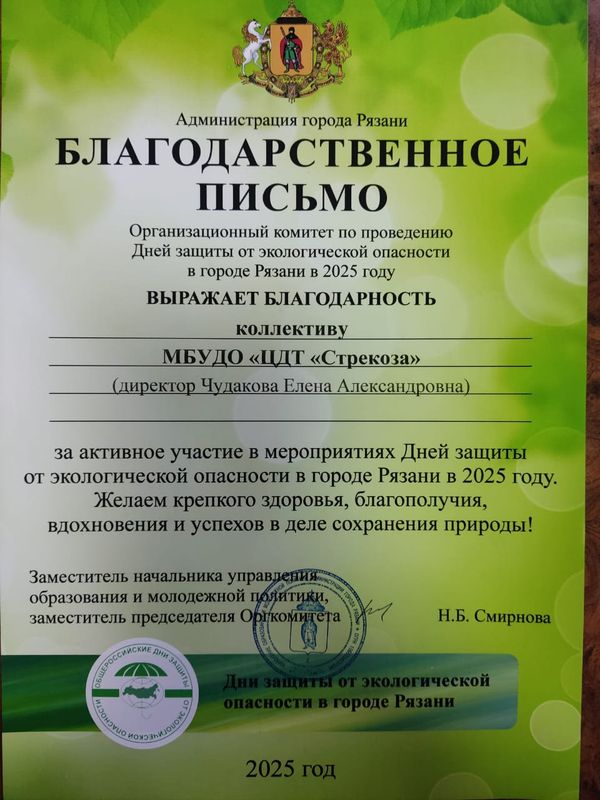 25 сентября 2025 года состоялась конференция «Дни защиты от экологической опасности», на которой коллектив ЦДТ «Стрекоза» был отмечен благодарственным письмом организационного комитета.